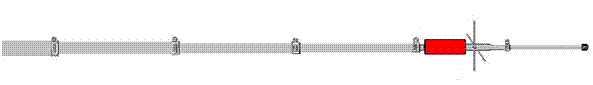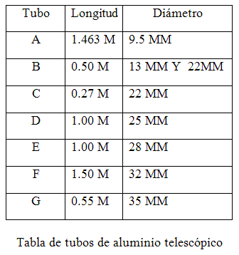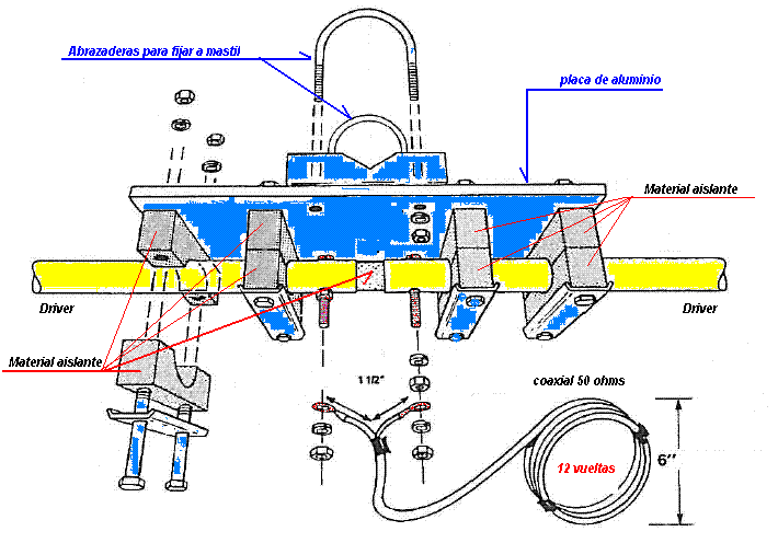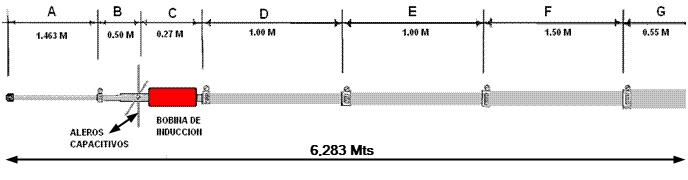 Opción No. 2: Las bobinas de inducción se construirán con 20 espiras de alambre de aluminio o cobre de 2.59 mm de diámetro calibre no. 10, separación libre entre espiras de 1.8 mm, envueltas sobre un núcleo aíslate, de 5.4 cm de diámetro y ocupando una longitud de 8.8 cm de largo inductivo. Para obtener 10.238 micro-henrios de inductancia. Opción No. 3: Es enrollar 77 vueltas alambre calibre no. 14 de 1.63 mm de diámetro, en un núcleo aislante de 2.2 cm, con una separación libre entre espiras de 1.8 mm, sobre una longitud inductiva de 26.5 cm. Para obtener 10.238 micro-henrios de inductancia. Opción No. 4: Es enrollar 70 vueltas alambre calibre no. 16 (1.295 mm de diámetro), en un núcleo aislante de 2.2 cm con una separación libre de 1.8 mm, sobre una longitud inductiva de 21.7 cm. Para obtener 10.238 micro-henrios de inductancia. Notas importantes. Radiales de aleros capacitivos con tubo de aluminio de ¼" diámetro x 72 cm de largo atornillados a tubo de aluminio horizontal de 22 mm de de diámetro. Dimensiones de la Antena Caracteristicas de los cables de cobre para construir la bobina. Detalle de sopote sobre mástil o torre