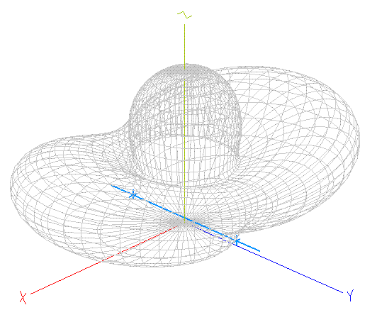 Diagrama de radiación tridimencional del dipolo rotativo para 40 metros con elementos capacitivos