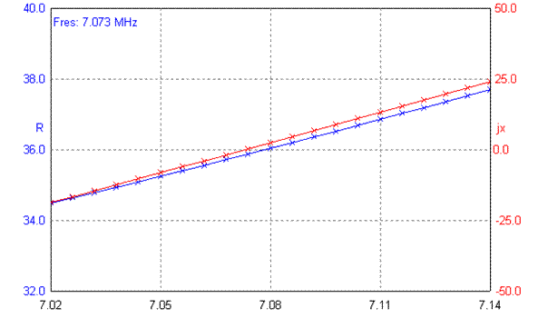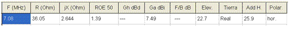 Tabla que nos muestra la resonancia de la antena en 7.073 donde cancela la reactancia inductiva XL y capacitiva XC = CERO.