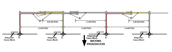 Son 4 Irradiantes de 84 cms cada uno, con tubos de aluminio de 3/4 de pulgada. Para su alimentación poseen 4 adaptadores Gama Much, los gama están construidos con tubos de aluminio de 1/2 pulgada y su longitud es de 17,5 cms, la separación entre el irradiante y este es de 3 cms y se cortocircuitan estos con una chapa de aluminio. El vivo del coaxial ( D ), se coloca dentro del tubos de 1/2 pulgada para que haga el efecto de condensador. Por mas detalles del gama, pulse aquí.