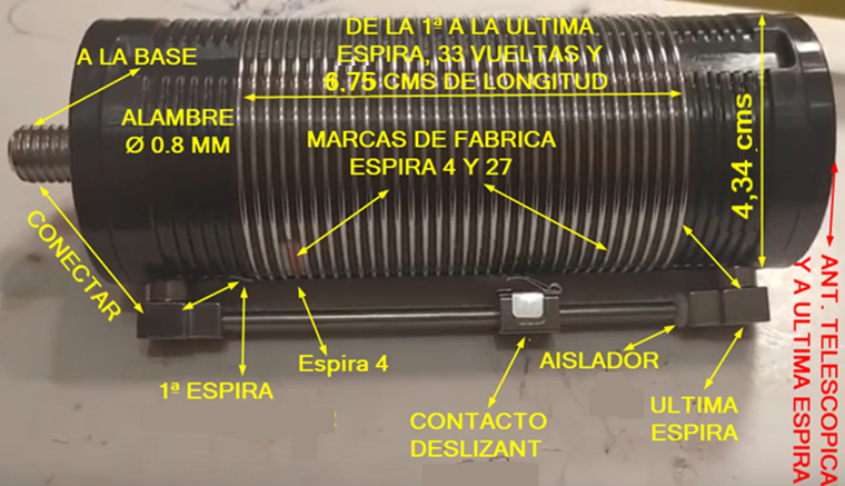 Segun el fabricante, lleva una marca en la 4 espira ( para la banda de 40 metros ) y otra marca en la espira 27 ( para la banda de 20 metros).