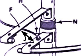 F = brida que conecta la extremidad del tubo M a la antena vertical S.
