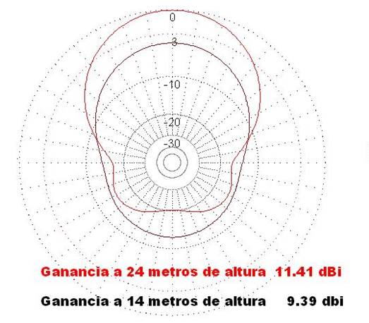 La ganancia Frente espalda FB a 14 metros de altura es cercana a 12dB o de 30 dB a 24 metros de altura de sobre el suelo.