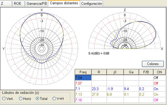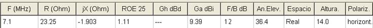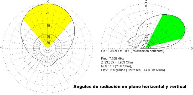 El ángulo de elevación de la radiación en el plano vertical, para una altura de 14 metros se encuentra en un rango cercano a los 36 grados con respecto al horizonte, lo cual es aceptable para el Dx, más sin embargo este puede bajar más si elevamos la antena arriba de los 14 metros.
