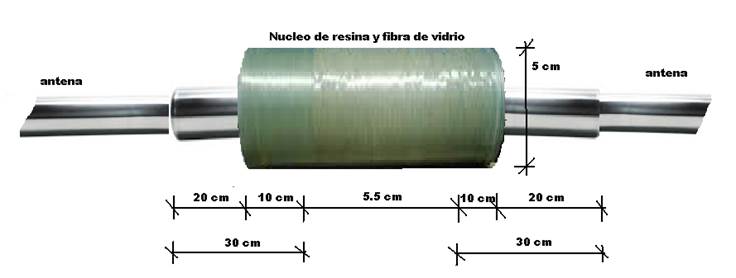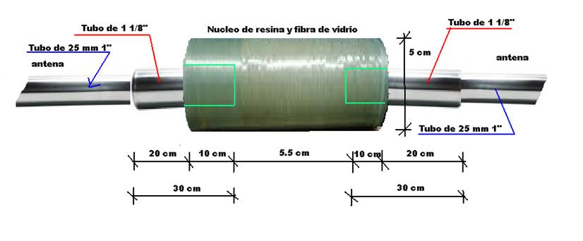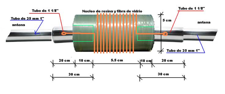 Para embobinar el alambre calibre 10 primero se construirá un nucleo con resina poliéster catalizada, y agregando fibra de vidrio para darle consistencia, este núcleo se vacia dentro de un molde de Tubo de PVC, que después eliminaremos, dejando solamente el nucleo de 5 cm de diámetro x 25.5 cm de longitud, en el cual alojaremos dos tubos de aluminio de 30 cm cada uno, los cuales penetrarán 10 cm en la resina para que nos sirva de soporte para conectar a los tubos de los elementos de la antena. Y en el espacio de 5.5 cm al centro es donde formaremos la bobina correspondiente conectándola a los dos extremos de cada brazo de aluminio.
