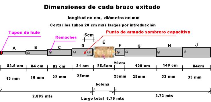 El largo de los dos apéndices de la bobina de 10 cms cada uno influye en la longitud de la antena.
