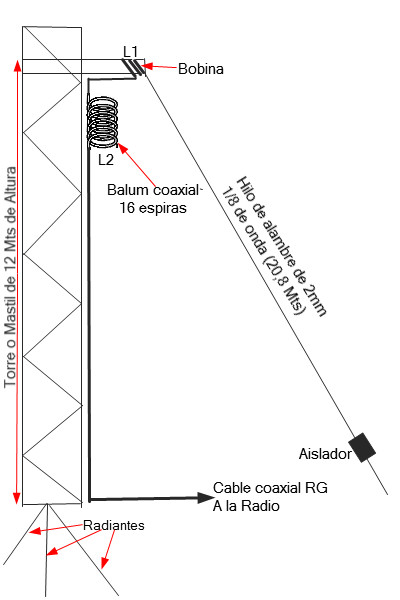 Mi idea es diseñar un medio de largo Sloper (1/8 l) con una carga inductiva se coloca directamente en la parte superior del alambre, buscando el mejor compromiso con los radioaficionados efficienza. Quien no tienen disponible un espacio de 12m puede reemplazarlo con un árbol; utilizando un alambre vertical conectado a tierra, que sustituye a la torre o mastil.