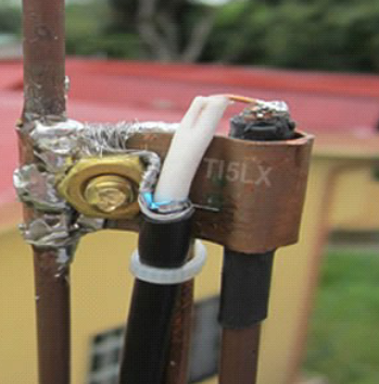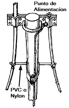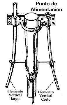 En el punto de alimentación, uno de los brazos (5) va aislado del resto de la antena. Ahí ira el centro del cable coaxil, la malla va al resto de la antena.