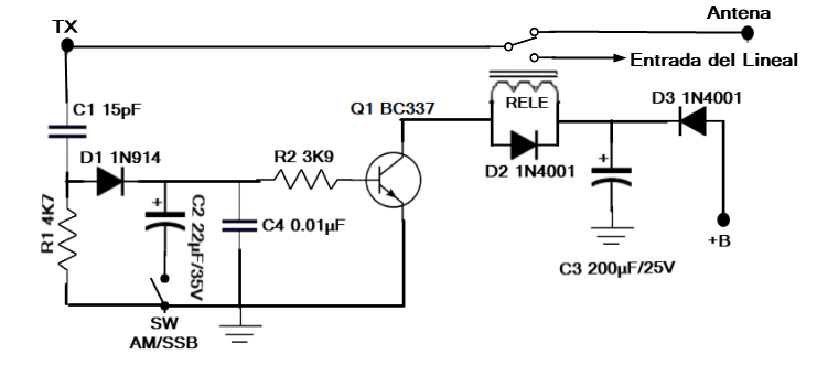 1N4148 y filtrada por 10 nF obteniendo un nivel de tensión más que suficiente para llevar a la conducción del BC547 que activará el relé durante Tx. En SSB, se conectará el condensador electrolítico a masa, el cual se descargará durante los intervalos de modulación a través de RV2 y el transistor hacia masa.
