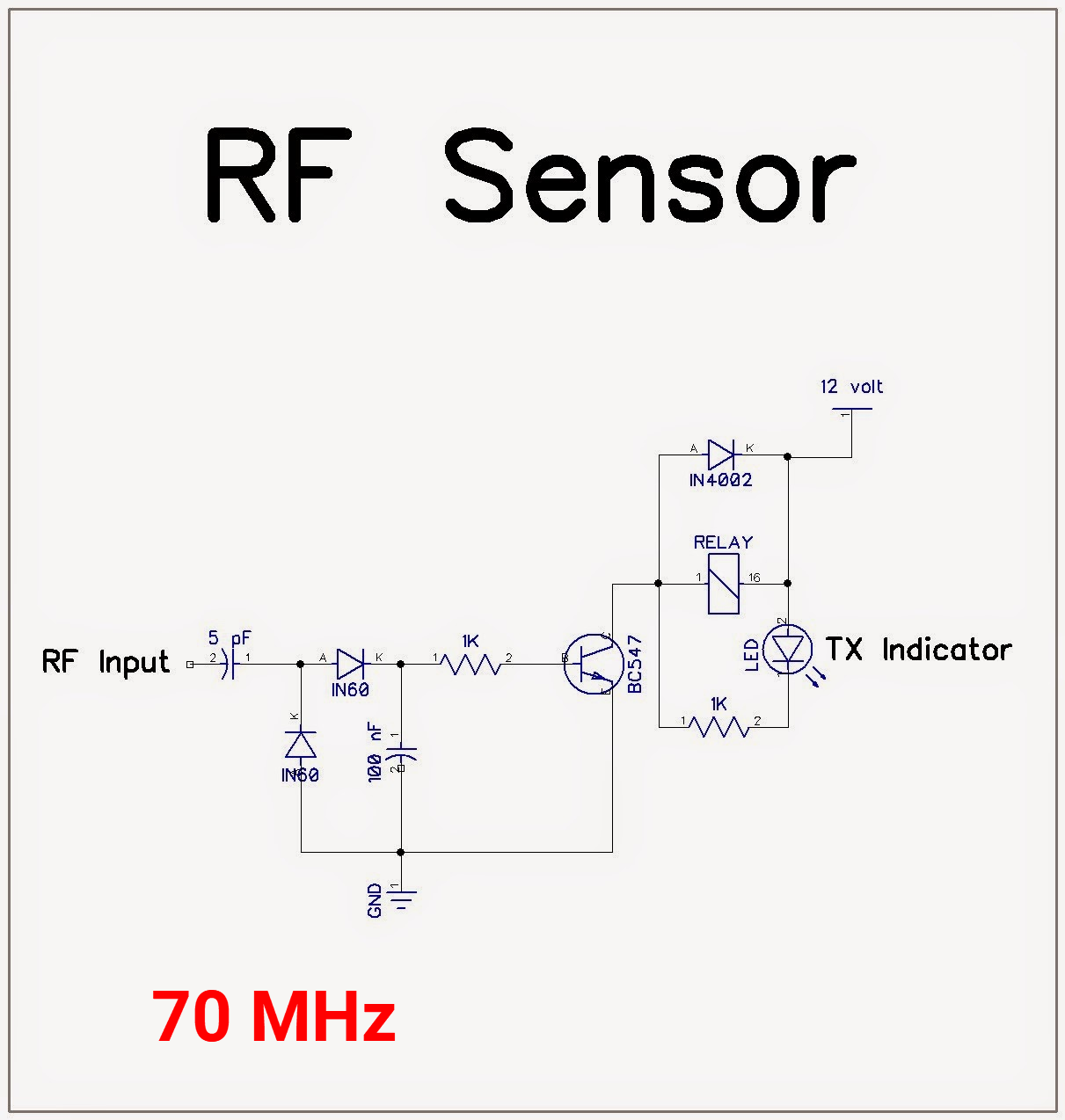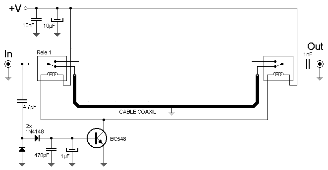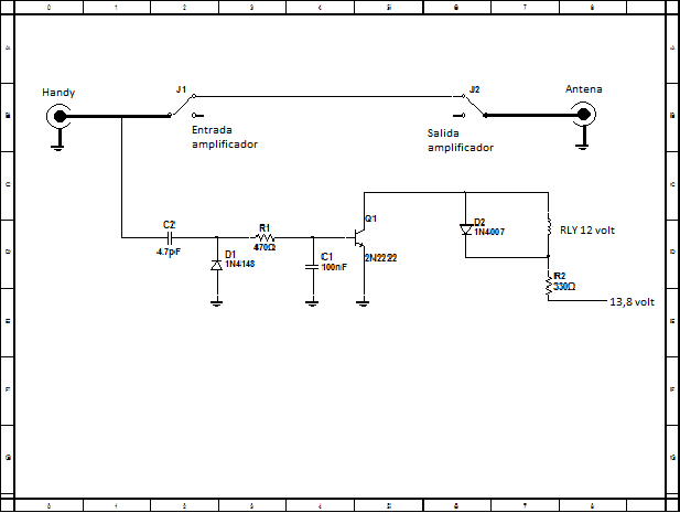 Su funcionamiento es sumamente facil este toma parte de la señal excitadora atraves de C1 esta se rectifica por D1 transformando la señal de rf en un voltaje continuo R2 polariza a Q1 para llevarlo a la zona de saturacion para poder energizar el rele y por ultimo D2 elimina los pico.