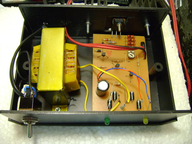 Nótese que el puente rectificador es de 10 amperios (tensión igual o superior a 50V) por lo que no es para soldar en circuito impreso sino atornillar a la caja metálico del equipo y conectar por medio de terminales crimpeadas. El condensador de filtrado inicial puede ser soldado sobre la placa o puede ser abrazado en la caja por medio de dos precintos plásticos y soldado en paralelo con los terminales positivo y negativo del puente de diodos. EL interruptor general es del tipo que tiene en su interior la lámpara de gas de neón que se ilumina al encender el equipo. Prestar mucha atención a como se conecta este interruptor dado que es muy común confundir las terminales y poner en corto la línea de 220V. El regulador LM338 debe ser montado fuera del circuito impreso sobre un adecuado disipador de calor de no menos 10 x 10 cm. de superficie. Si se quiere, se puede colocar un amperímetro de CC en serie con el borne positivo de la salida hacia la batería para monitorizar visualmente el estado de corriente de la carga.