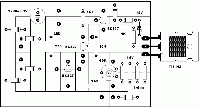 Aquí vemos la isposición de los componentes en la placa. El TIP142 debe montarse en un disipador. Los diodos que vemos en serie con el zener pueden no ser necesarios, normalmente se puentean. Van en el caso de tener un zener de 13V o parecido, se ponen para aumentar la tensión en la base del TIP.