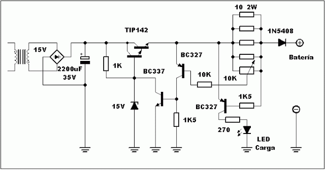 Vemos aquí un circuito sencillo. Consta de un TIP142 y un zener (en la placa se pueden agregar un par de diodos si es necesario) para que en el emisor del Darlington tengamos entre 14 y 15 Volt. Luego se conecta a la batería por medio de una resistencia de 2,5 ohm formada por 4 resistencias de 10 ohm 2W y un diodo tipo 1N5408 para evitar conectar la batería al revés. Esta resistencia es sensora de corriente. Vemos un BC327 conectado a un LED, cuando circulan por esta resistencia unos 200mA se enciende el LED de "carga", indicando que la batería está tomando corriente. El otro BC327,que está conectado a un preset, está asociado a un BC337 que cuando la corriente supera un punto elegido por el usuario (unos 600mA por ejemplo) la tensión cae. Esto hace que a corriente se limite a no más de 1/10 de la capacidad de carga de la batería, fundamental cuando está descargada, para que no genere gases y se infle. El ajuste se hace conectando una lámpara a la salida y regulando con un amperímetro la corriente de salida (con el preset).