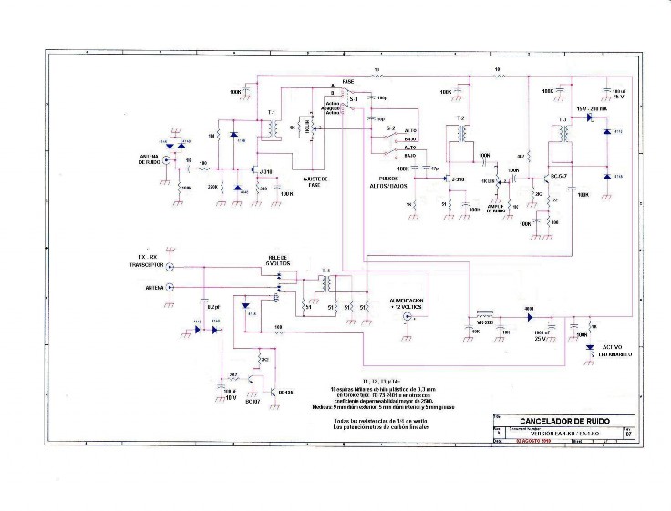 Hay que recalcar el conexionado y devanado de las bobinas toroidales que deberán ser hechas exactamente como se muestra en los dibujos, para que las señales queden siempre en fase, porque en caso contrario el dispositivo no funcionará correctamente, y no eliminará los ruidos; a partir del fotolito abajo incluido, y reproduciéndolo a un tamaño real de 113 mm por 70 mm, se podrán obtener las pistas de la placa.