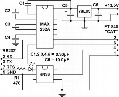El corazón de esta interfaz es un MAX232A. Usted puede usar cualquier chip similar MAX203, MAX232 o MAX233, pero consulte su documentación de las conexiones apropiadas. De la fuente de alimentación + 5 voltios viene del regulador de voltaje 78L 05 que toma +13.5 voltios desde la parte trasera de la radio de FT-840 (conector RCA). PTT se controla mediante optoacoplador 4N33 por la señal de RTS de RS-232. He utilizado un puerto serial DB9. Si utilizas un DB25, tienes que cambiar los números de pin DB25 asignaciones de acuerdo. Conector CAT de Yaesu es 6 pin Mini DIN.