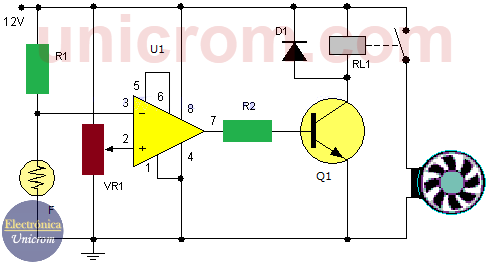 Este control de temperatura con comparador permite controlar la activación y desactivación de un ventilador de 12 voltios con un termistor (resistencia que varía su valor con la temperatura).