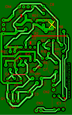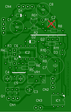 Debido a un error al dibujar el C2 en el PCB, las pistas no están en la posición correcta con respecto a masa. Si se monta con el PCB de la página no se debe poner el C2. Eliminar el C2 del circuito no afecta a su funcionamiento, ya que con el filtrado del C6 es suficiente.
