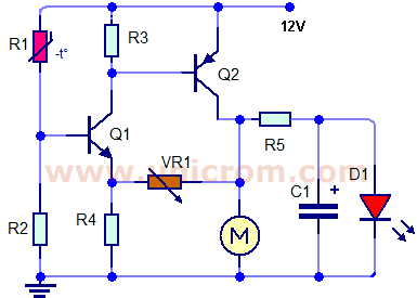Al disminuir le voltaje en la base de Q2, este se saturará cada vez más, haciendo que el voltaje colector-emisor (VCE) sea cada vez menor y por consiguiente se incremente el voltaje en el terminal superior del motor. El valor máximo aplicable al motor CC es ligeramente menor de 12 voltios. Como elemento adicional, y que no es necesario para el correcto funcionamiento del circuito, para conocer la temperatura a controlar y velocidad del motor se coloca un diodo . Este diodo aumentará su intensidad de su luz a medida que la velocidad del motor aumente.