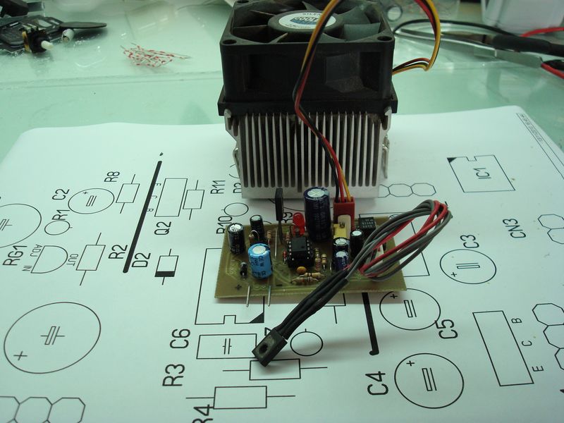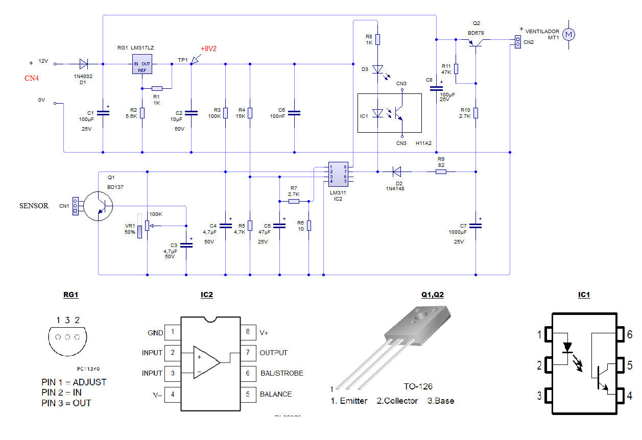 El circuito está pensado para sea lo más sencillo posible, con componentes normales y baratos, pero que a la vez sea lo más flexible posible y que se pueda utilizar como modulo en diferentes aplicaciones. El circuito empieza por la alimentación de 12V CC en el conector CN4 y con el diodo D1, el D1 es una protección contra descuidos por inversión de polaridad. lo sigue un regulador del tipo ajustable que es súper conocido lm317, pero en versión mini el LM317LZ que puede entregar como máximo unos 100mA, este circuito se ha fijado a una tención de 8,2V por medio de un divisor de tención compuesto por R1 y R2.esta tención es la que alimenta el IC2 LM311 y le sirve como referencia fija de tención por medio de las resistencias R4,R5.el sensor es el transistor Q1 muy común un BD137, el ajuste de la temperatura se realiza por medio de un trimmer VR1, este tiene que ser multivuelta para que el ajuste sea lo más preciso posible. En la salida del IC2 patilla 7, por una parte tenemos un LED D3 indicador de funcionamiento y en serie un optoaislador que sirve como posible comunicación externa del circuito. Por otra parte tenemos un driver construido a partir de un transistor Darlington el Q2.el Q2 junto con R9, R10, R11 y C7 implementan un temporizador que al producirse la desconexión del circuito, ralentizan poco a poco el giro del ventilador hasta detenerlo, con esto se evita en gran medida la posible histéresis del circuito y le da un margen de actuación