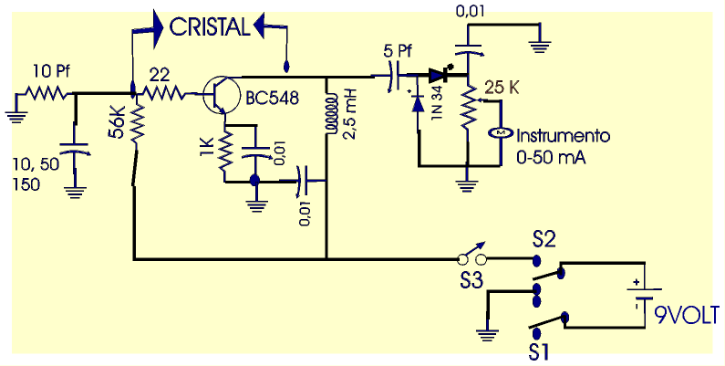 El circuito utiliza un oscilador Pierce. Este tiene como principal función probar cristales, pero también puede ser utilizado para probar transistor bipolares. El transistor a utilizar puede ser: 2N4124; MPS3563 o HEP53. Este probador funciona bien con cristales que tengan frecuencias superiores a 455 KHz. S1, es una llave unipolar, cuanto más baja sea la frecuencia del cristal, mayor será la capacidad del condensador. Si poseemos un cristal con frecuencia desconocida, podemos colocar un frecuencimetro a la salida del colector del transistor, para verificar la frecuencia del cristal. Si no poseemos un frecuencimetro digital, con un equipo de banda corrida, podemos averiguar la frecuencia, en este ultimo caso deberemos acercar el oscilador al equipo y buscar batido cero en el transceptor.