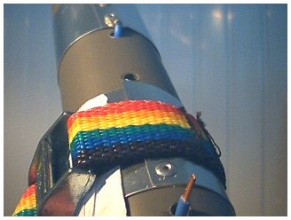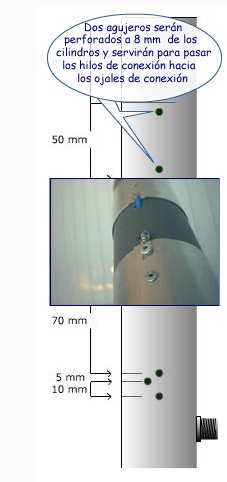 Cuando los cilindros hayan sido firmemente sujetados al tubo de PVC gris, marque donde realizar los agujeros para fijar los cilindros al tubo de PVC y para la conexión de los hilos a los cilindros de aluminio. Los agujeros deberán realizarse en la zona de cada cilindro donde se superponen los extremos de la hoja de aluminio. Realice con una broca de 3 mm los agujeros, perforando el tubo de PVC, y fije los cilindros de aluminio de forma definitiva utilizando los remaches en estos agujeros, sin olvidar poner un ojal o arandela de soldadura en cada uno de los dos agujeros donde deberá conectarse a cada cilindro el hilo de conexión correspondiente.