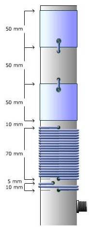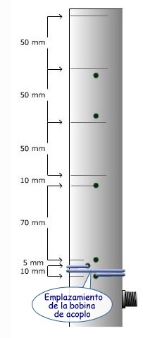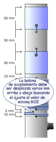 La bobina de acoplamiento (o bobina fuente), de dimensiones fijas, será desplazada deslizándola verticalmente durante los ajustes para buscar la mínima ROE. Puede ser útil a este respecto alargar la forma de los agujeros por los que pasan los extremos de la bobina, dándoles forma de ranuras verticales.