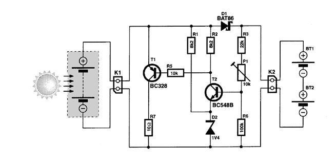 Cuando esta tensión aumenta por encima de los 2 V (1,4 V más la caída de tensión base-ernisor de T2), el transistor comienza a conducir. Esto coloca la base del transistor T1 a un nivel más bajo, por medio de la resistencia R5, lo que hace que el transistor T1 comience a conducir. La corriente proveniente del panel solar es desviada a través de la resistencia de potencia R7 (normalmente sería suficiente una resistencia de 10 ohmios y de 1 W). Esto provoca que la tensión del panel solar disminuya, deteniendo el proceso de carga de las baterías.