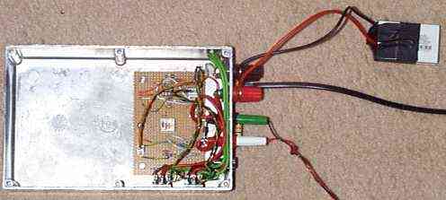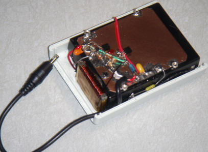 ¡No copie mi técnica de montaje! En primer lugar, tuve que cortar todos los puntos de anclaje del interior de la caja que empleé para poder colocar la batería de NiCad, y ésta la fijé con pegamento. Observe las tuercas plateadas soldadas a la placa impresa para asegurar la cubierta. En segundo lugar, la circuitería tiene muy poca altura, por lo que todo es presionado sobre un trozo de placa de cobre empleando pequeños trozos de placa sobre las que hacer las conexiones. Eso es una buena técnica, pero este prototipo era demasiado apretado para aplicar esta técnica cómodamente. En tercer lugar, tuve que emplear un cierto tiempo para encontrar una bobina que se acomodara en la caja. Todo el espacio se agotó antes de llegar a uno de los componentes más grandes. Habiendo dicho todo esto, la unidad final es muy compacta y sólida, y tuve mucha suerte al poder realizarla.