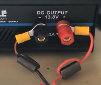 Para ello a la entrada del transeptor, 13,8 Volt, usaremos ferrites de clips. Podremos hacerlo de dos maneras; uno es con un ferrite darle unas 3 o 4 vueltas al cable dentro de la ferrite como se ve en la figura a continuacion: