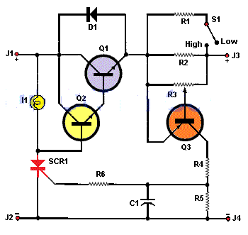 El potenciómetro R3 establece la corriente máxima permitida por el fusible. Cuando la corriente pasa a través de R2 o R1, dependiendo de la opción escogida con el interruptor S1, y se excede el límite de corriente establecido, el transistor Q3 conduce. El voltaje positivo resultante a través de la resistencia R5 activa el tiristor, la resistencia R6 limita la corriente en la compuerta del tiristor a un valor seguro.