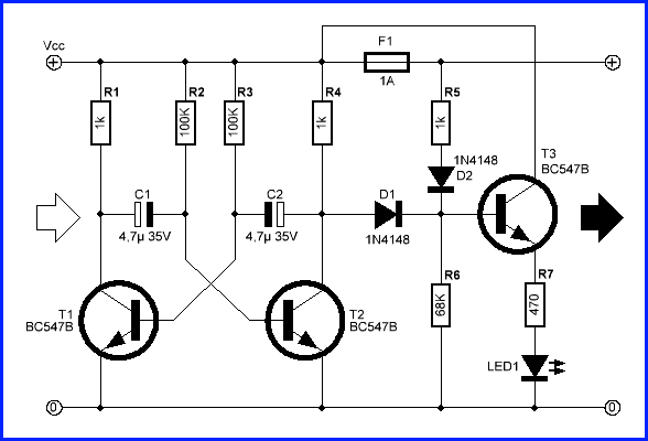 Está compuesto por tres transistores bipolares muy comunes, dos condensadores, dos diodos, un LED y unas pocas resistencias. Observa el esquema con detenimiento. Para verlo a un tamaño mayor y con más comodidad, clica sobre él y se abrirá una nueva ventana.