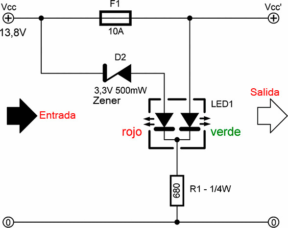 Si se desea usar este montaje para monitorizar fusibles en circuitos de corriente continua, por ejemplo con tensiones de 13,8V, los diodos rectificadores 1N4007 sobran y habrá que bajar los valores de la resistencia R1 y la tensión del zener. En este caso el circuito podría quedar así.