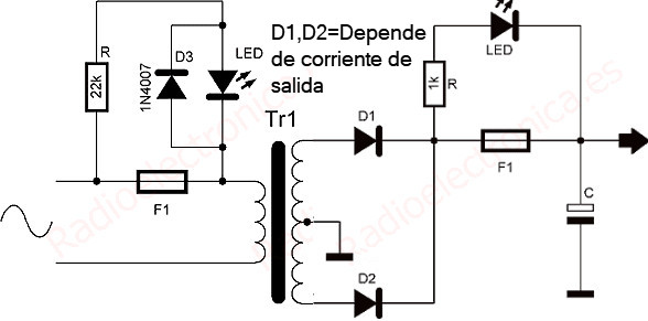 Es fácil adivinar que el circuito que tendríamos que añadir a la fuente de alimentación es el constituido por el diodo LED y por la resistencia R que hemos supuesto de 1K (680 Ohms para 13,8 Volt) y de medio vatio de potencia para tensiones máximas de 25 voltios en la carga.