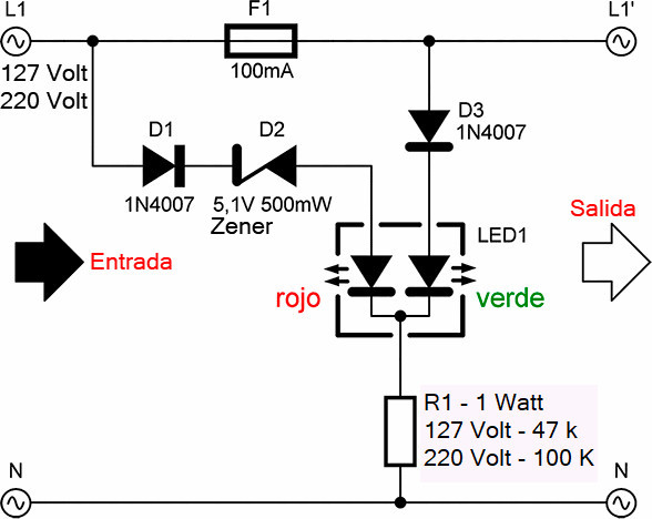 Si se va a utilizar el circuito en redes eléctricas antiguas de 127VAC bastará con fijar el valor de la resistencia R1 en 47K usando una potencia máxima de disipación de solo 0,5W.