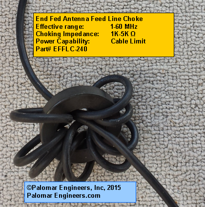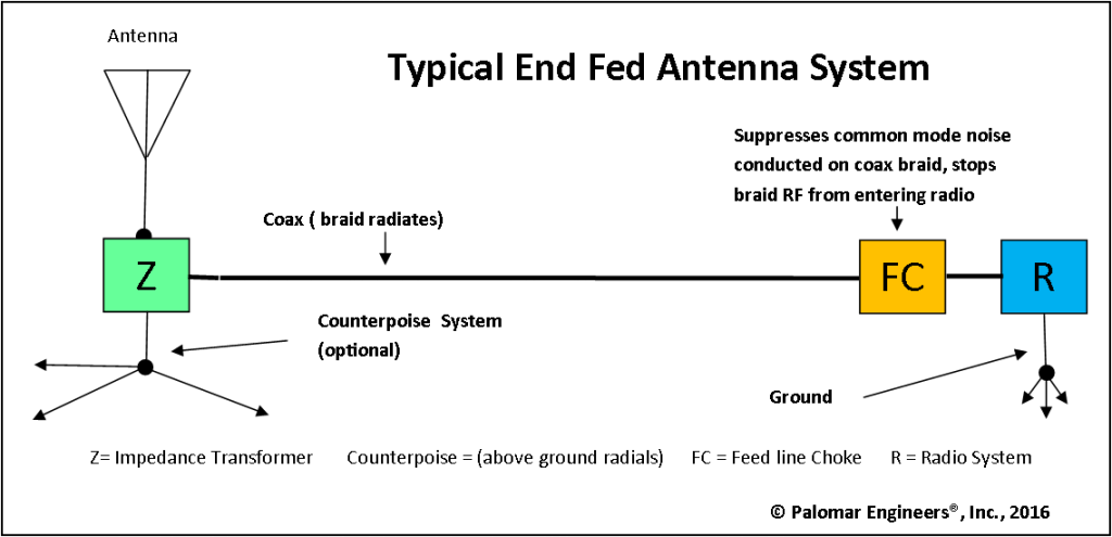 Con las antenas alimentadas por el extremo, el coaxial está destinado a radiar como parte del sistema de antena (sirviendo como "tierra" o contrapeso) y, por lo tanto, debe usar un estrangulador de línea de alimentación (CUADRO "FC" arriba) para suprimir la corriente de modo común en el exterior de la línea de alimentación coaxial para que no entre en el radio y provoque una comunicación distorsionada. La línea de alimentación (FC) actúa como una señal de alto para la corriente de RF que fluye hacia atrás en el exterior del coaxial. Cuanto mayor sea la resistencia de estrangulamiento del estrangulador de la línea de alimentación, menor será la corriente de modo común RFI de la trenza coaxial y menos ruido entrará en la radio. Las alternativas de estrangulador de línea de alimentación están AQUÍ .