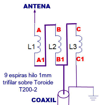Aqui les dejo el circuito del UNUN para esta antena: