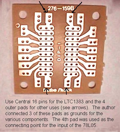 I chose to use some pre-punched general purpose DIP circuit board, a 16-pin DIP socket, 4 standoffs, 2 grommets and a tiny aluminum case to wire the circuit - which would add about $6 to the cost. Opté por usar algunos preperforado de propósito general DIP de tarjetas de circuitos, un conector 16-pin DIP, 4 empates, 2 arandelas y una pequeña caja de aluminio para cablear el circuito - que se añaden alrededor de 6 dólares al costo. Anal-retentive hams can etch and drill their own circuit boards! Anal-jamones de retención puede grabar y perforar sus propios circuitos! I'm sure some industrious hams will figure out a way to package the whole circuit inside a DB9 shell! Estoy seguro de que algunos jamones industriosa se darán cuenta de una forma de paquete de todo el circuito dentro de una cáscara DB9!