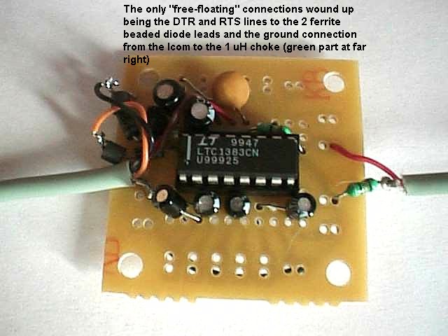 The ICOM CT-17 RS232 computer level converter is both costly and requires external power. El ICOM CT-17 equipo convertidor RS232 nivel es costoso y requiere de alimentación externa. By using a cheap, readily available ultra low power TTL to RS232 converter IC, the Linear LTC1383, one can make a self-contained unit, which derives its power from the serial port itself. Mediante el uso de un método barato y fácilmente disponible de potencia ultra baja TTL a RS232 Conversor de IC, la LTC1383 lineal, se puede hacer una unidad autónoma, que deriva su energía del puerto serie. Although the IBM PC serial port was designed without a DC power pin, early mouse designers figured out a way to squeeze some low-current DC power from RTS or DTR lines (or from BOTH in the case of the design shown above). Aunque el puerto serie de PC de IBM fue diseñado sin un contacto de corriente DC, diseñadores tempranos de ratón descubierto una forma de compresión de algunos de bajo consumo de corriente DC de estrategia en tiempo real o líneas DTR (o de ambos en el caso del diseño que se muestra arriba). The LTC1383 draws only about 220uA at 5 volts - far less than most mouse circuitry. La LTC1383 basa sólo 220uA a 5 voltios - mucho menos que la mayoría de los circuitos de ratón. The above circuit should work with just about any serial port, including some otherwise finicky PC laptop ports. El circuito anterior debería funcionar con casi cualquier puerto serie, incluyendo algunos puertos de otro modo meticuloso PC portátil. The LTC 1383 IC does all the work and requires only 4 capacitors to charge the internal pump circuits. El IC 1383 LTC hace todo el trabajo y requiere sólo el 4 condensadores para cargar los circuitos internos de la bomba. Although one can use tiny 0.1uf non-polarized caps for the 4 charge caps, I chose some 0.47uf miniature polarized radial electrolytics to be extra sure of speedy response times in the heat of DX J . Aunque se puede usar pequeños 0.1UF no polarizado tapas para las tapas de 4 carga, he hecho algunas 0.47UF miniatura polarizados electrolíticos radiales para estar más seguro de los tiempos de respuesta rápida en el calor de dx. All parts are available at the time of this writing online from RadioShack.com, but might be hard to find at the retail stores. Todas las piezas están disponibles en el momento de escribir este artículo en línea de RadioShack.com, pero puede ser difícil de encontrar en las tiendas al por menor. I have no affiliation to Radio Shack, but enjoy their excellent website and variety of fairly cheap parts. No tengo ninguna afiliación a Radio Shack, sino disfrutar de su excelente sitio web y la variedad de piezas bastante barato.