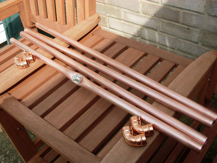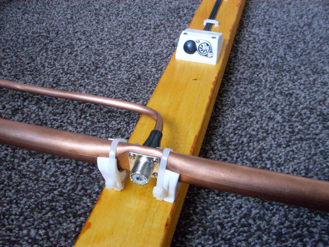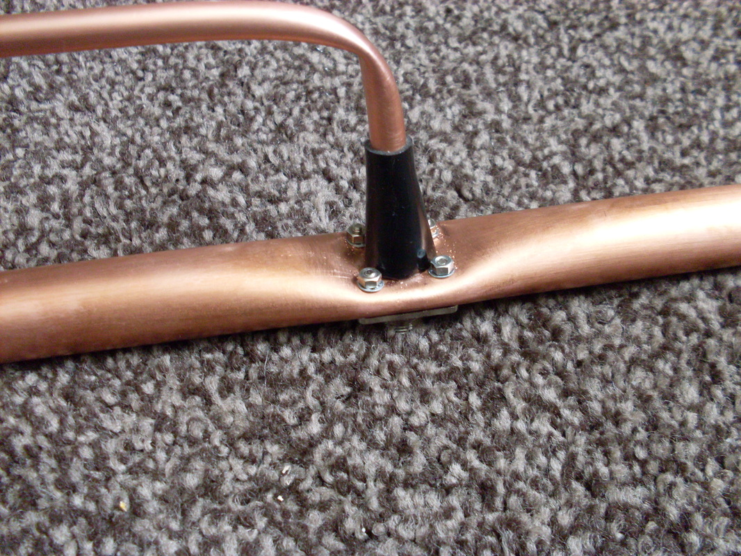 Estas son las 4 piezas de tubo y codos de 90 grados listos para soldar juntos. El zócalo SO239 está colocado en el centro de uno de los tubos, notará que el tubo debe "aplastarse" lo suficiente para acomodar el zócalo.