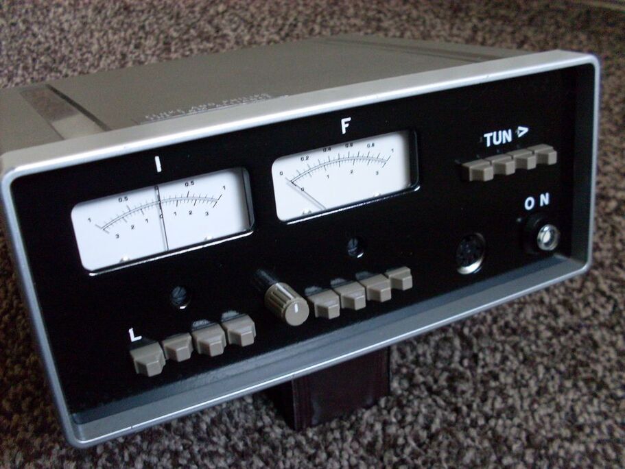 Esta es la vista del panel frontal de la unidad de control. El medidor de cero central a la izquierda lee la corriente del motor y el de la derecha es para sintonizar la posición del condensador que, con la ayuda de una pequeña tabla de conversión, indica la frecuencia. Los cuatro botones a la derecha de los medidores son para sintonización rápida y lenta y el enchufe DIN debajo es donde se conecta el mouse para permitir una sintonización precisa cuando la unidad está montada en un estante.