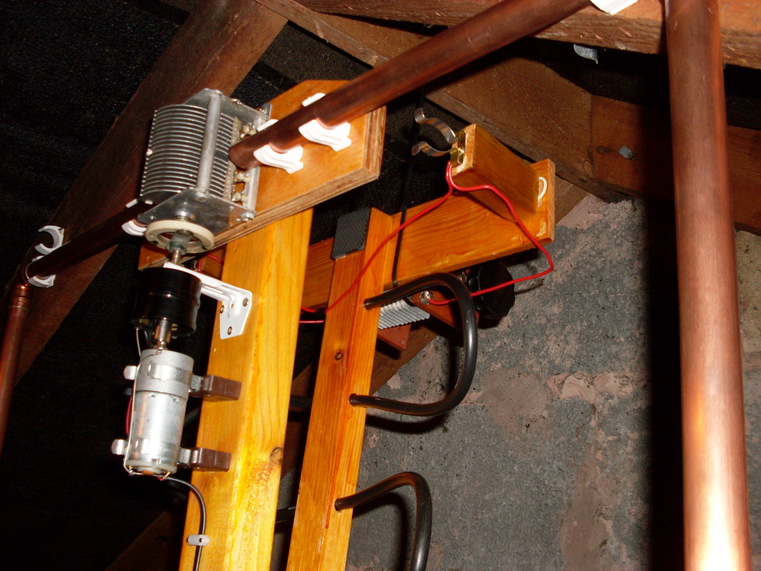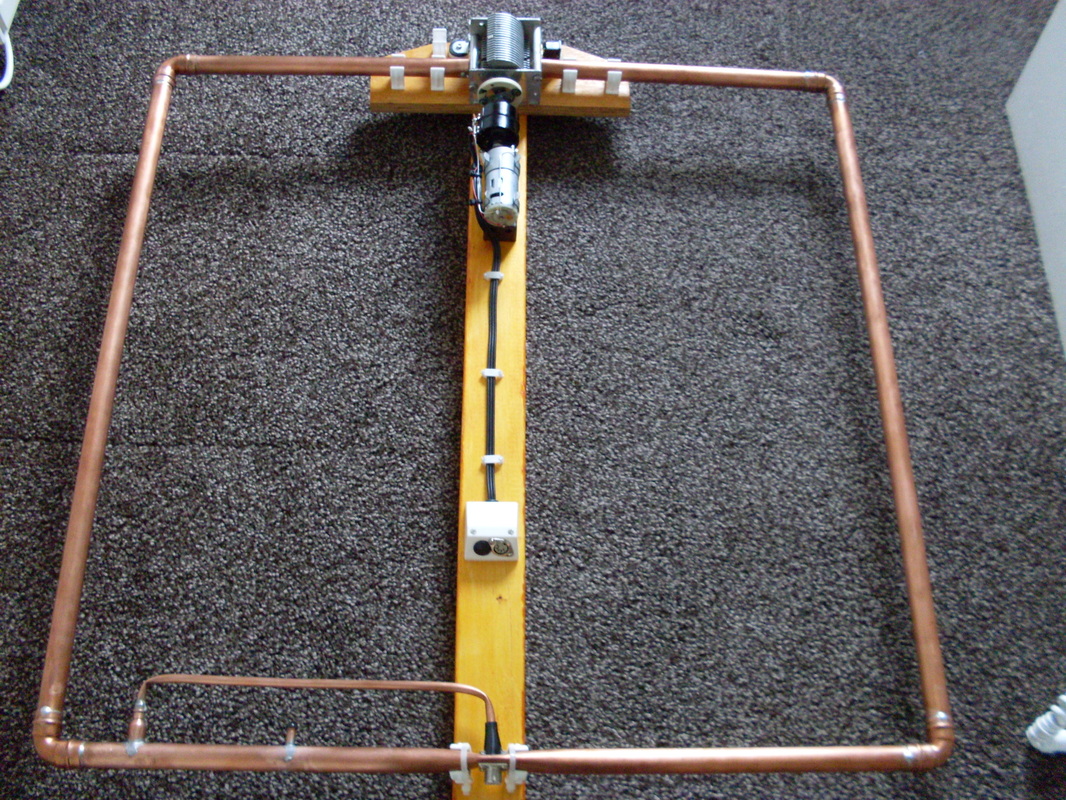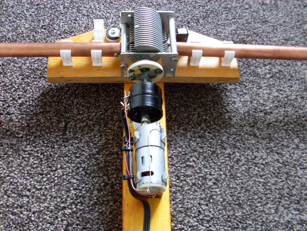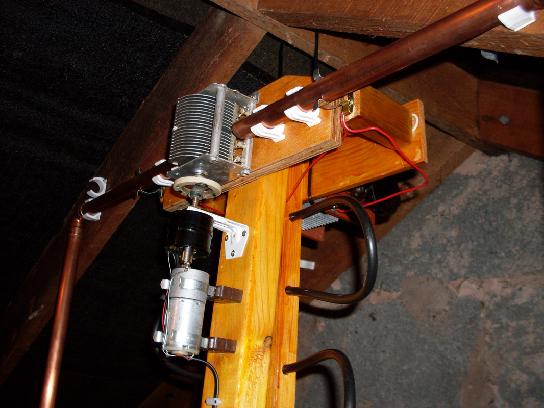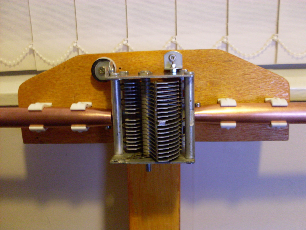 El condensador de sintonización de espacio amplio que se utiliza es un 200pF + 200pF pero las paletas fijas están conectadas en serie, las paletas móviles no estarán conectadas en absoluto, por lo tanto, la capacitancia puede variar desde aproximadamente 7pF min hasta 100pF max. La capacitancia mínima es importante ya que determina la frecuencia más alta a la que puede resonar el bucle. El tubo en el lado opuesto a la coincidencia gamma se marca en el medio y luego se coloca el condensador de sintonización y se corta una cantidad igual para acomodar exactamente el condensador de sintonización utilizado para que se puedan hacer conexiones directas. Las dimensiones de la coincidencia gamma son bastante críticas para lograr una buena coincidencia en cada una de las bandas cubiertas, está hecha de tubería de calentamiento de micro calibre de 8 mm . El condensador de sintonización es accionado por un motor reductor que produce2 rpm a 12 voltios. Se emplea un potenciómetro de 10k ohmios enrollado en alambre que se inserta entre el motor y el acoplador de aislamiento del condensador de sintonización que envía la información requerida de regreso a la cabina para impulsar un medidor de bobina móvil que se puede calibrar en frecuencia. El bucle cubre de 14 a 29,7 Mc/s y presenta una ROE de uno a uno en todo momento.