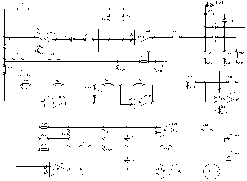 DESCRIPCIÓN DEL CIRCUITO. Los amplificadores operacionales 1A y 1B forman un oscilador regenerativo de 100 kHz. C1 determina la frecuencia junto con R1, cuyo valor permite ajustarla. D2 y D3 recortan los picos superior e inferior de la forma de onda resultante para que el nivel y la frecuencia sean estables ante cambios de tensión de alimentación. R8 es la carga de la salida de 1B. A través de los terminales de prueba se acopla la salida de 100 kHz a la resistencia de carga R9, donde el voltaje que se desarrolla es el indicador del valor de ESR del condensador bajo medición. C3 bloquea cualquier tensión continua presente. D4 y D5 protegen el medidor de corrientes de carga en C3. R7 descarga C3 tras la medición. D1 establece una polarización de 0,55 V. para el oscilador y las etapas siguientes, acopladas en CC en clase A. Esta polarización y la señal ESR de R9 se combinan a la entrada del amplificador operacional 1D, que las amplifica, así como 1C y 2A. El amplificador 2D está configurado como detector pico-a-pico. Cuando la señal de corriente alterna se hace más positiva que el nivel de polarización (unos 0,77 V.), la salida de 2D también se hace más positiva. C4 se carga al valor de pico de la señal alterna. Lo mismo sucede en el pici negativo e D7 y C5. R20 y R21 forman un circuito de realimentación. Las dos salidas del detector pico-a-pico se aplican a dos amplificadores de CC de alta ganancia, que excitan el medidor de 1 mA.