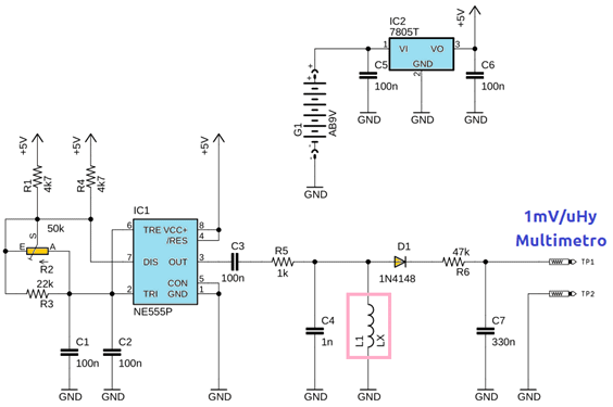 Este es un circuito muy simple que no puede faltar en el taller, se trata de un medidor de bobinas o inductancias basado en el timer 555, se requiere únicamente un multimetro o tester que pueda medir tensión continua.