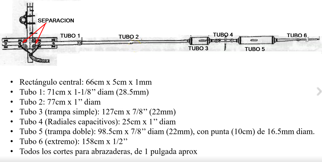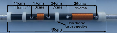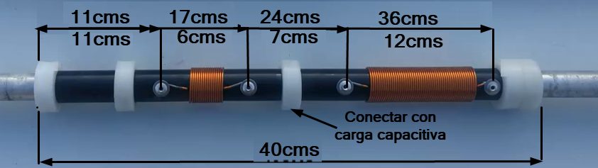 Esta antena, las bobinas de cargas son iguales que la anterior. Solo queda dar las medidas de los elementos.
