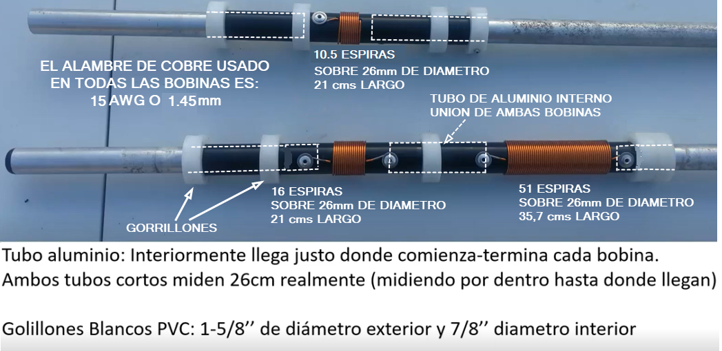 Note que los dos tubos de aluminio que vienen de la punta de la antena y del centro, llegan hasta donde empiezan las bobinas.