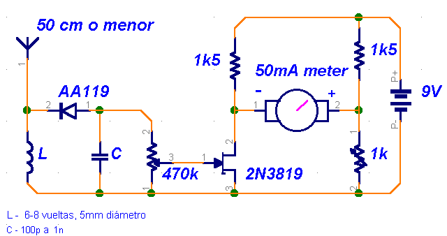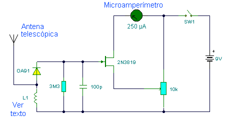 Se emplea un transistor MOSFET de doble puerta como amplificador de RF (tipo 3N140, 3SK35, 3SK37, o equivalente), que amplifica las señales captadas por la antena, y cuya amplificación es regulable mediante P1. Las señales de RF amplificadas son detectadas por el diodo de germanio D1, y puestas de manifiesto por el microamperímetro analógico (de aguja) M1 (100 µA de fondo de escala). Como antena puede emplearse una vara metálica de 30 cm de longitud o una antena telescópica.