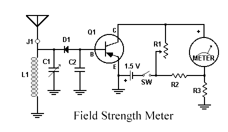 Circuito medidor de campo muy sencillo, y simple, y no es mas que un sencillo detector a diodos de la señal de RF que capta la antena (configurado como rectificador doblador de tensión). La señal rectificada es una corriente continua que es filtrada (allanada) por un pequeño condensador de 1 nf (1 KpF), y aplicada a un microamperímetro de aguja.