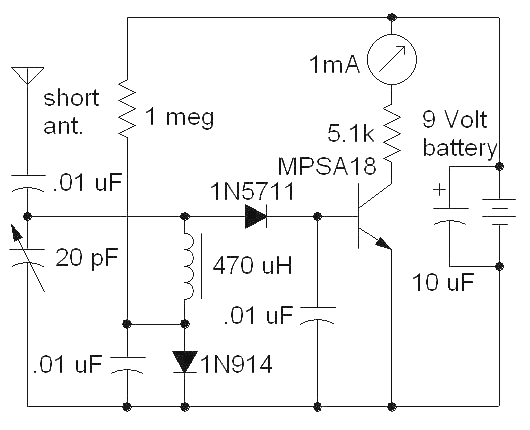 A destacar la polarización del transistor MPSA18, cuya base está ligeramente polarizada gracias a la resistencia de 1 Megohmio a positivo de alimentación y al diodo de silicio 1N914, conectado a masa, y que al ser un diodo de silicio, limita la tensión de polarización en el punto de unión de ambos componentes a 0,6-0,7 Voltios (caída de tensión directa del diodo de silicio). La muy débil corriente que circula por la resistencia de 1 Megohmio hace que la tensión de polarización de la base del transistor lleve a éste al punto de casi conducción a través del choque de radiofrecuencia de 470 µH (que aísla los dos componentes anteriores de la radiofrecuencia captada por la antena), y el diodo schottky 1N5711, el cual, debido a la pequeña caída de tensión interna que introduce, hace que la tensión de polarización base-emisor del transistor sea inferior a 0,6 volts, pero no nula, por lo que adopta un valor intermedio, que deja al transistor polarizado casi al punto de iniciar la conducción (polarizado en corte). En estas condiciones, las señales recibidas por la antena no necesitan alcanzar una vez detectadas por el diodo schottky la tensión de 0,6 voltios base-emisor necesaria para polarizar en conducción el transistor y así actuar el indicador analógico de aguja.