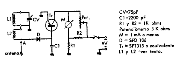 El arrollamiento L1 forma el circuito de sintonía LC con el condensador variable Cv, y es independiente del circuito detector y medidor propiamente dicho, al cual se acopla mediante el arrollamiento L2, no sintonizado. La tensión de RF inducida en L2 es detectada por el diodo D y filtrada por el condensador C1, siendo aplicada la tensión continua obtenida a la base del transistor Tr, el cual conducirá más o menos dependiendo del nivel de la tensión continua aplicada.