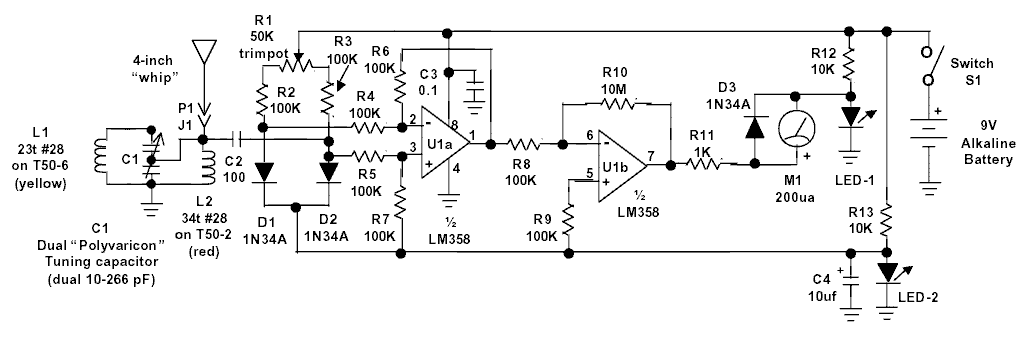 Sencillo medidor de campo extraído de freecircuitdiagram.com (y original de Meddium Wave Alliance), es un medidor de campo sintonizado y con amplificación de la corriente detectada por el diodo detector, requiriendo una baja tensión de alimentación (una simple pila de 1,5 voltios).
